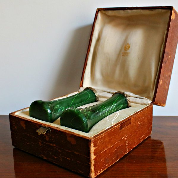 Дві абсолютно однакові вазочки з темно зеленого нефриту, неймовірно насиченого кольору з чорними вкрапленнями, відполірований до блиску і увінчаний срібним закінченням. Срібне кільце покрито позолотою, всередині якого стоять клейма 84 проба , » КФ» і голова Петербурзького пробірного управління. Висота кожної 12.5 сантиметрів, вага кожної з 185 грам. Ціна за запитом.